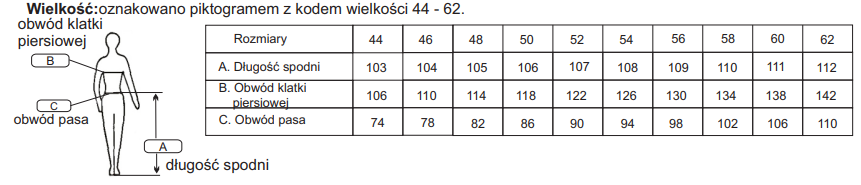 - Rozmiar 56, wzrost 174-182, obwód pasa 104, długość spodni 110